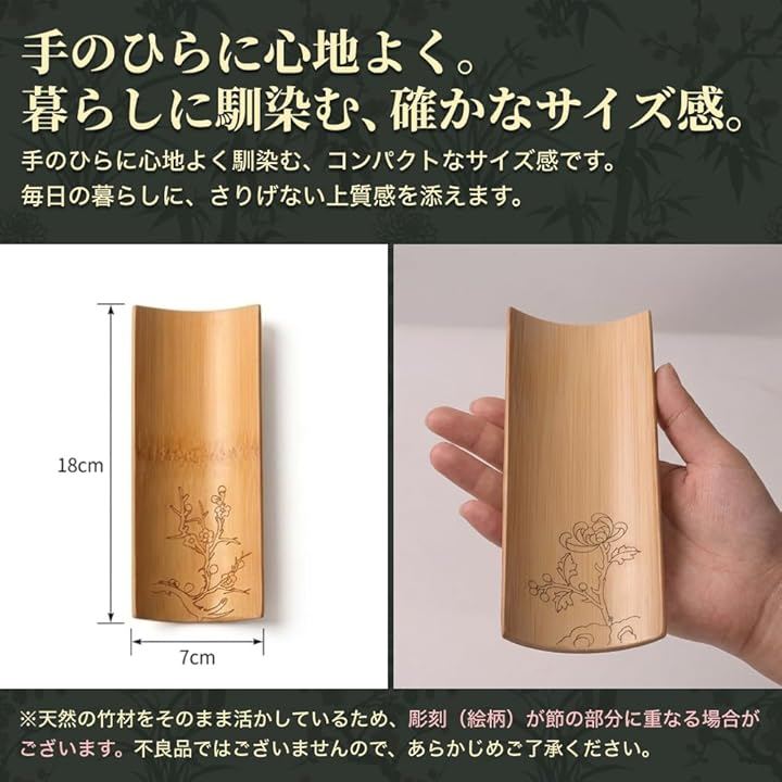 厳選された天然竹を丁寧に削り出して仕上げているため、節の位置・木目・色合いは一枚ずつ異なります。