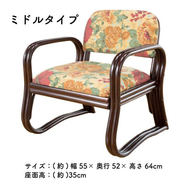 ●フレームに天然籐を使用した丈夫で座りやすい座椅子です。●軽いので女性でもラクに移動ができます。●立ち座りしやすくゆったりくつろげる肘掛け付き。●用途に合わせて3サイズから高さが選べます。●使うテーブルの高さに合わせて3種類からお選びください。●ロータイプ:座卓と一緒に。ミドルタイプ:立ち座りしやすい。ハイタイプ:ダイニングに。※手作業で生産される籐製品は表記寸法と若干の誤差がある場合がございます。※背もたれのクッションは取り外しができません。