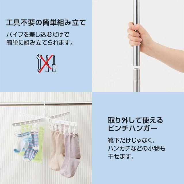 ●安定性バツグンの4本脚設計。●上段と下段のパラソル位置を調節でき、洗濯物同士の干渉を防ぎます。●上部ピンチハンガーは取り外して単独でも使用できます。