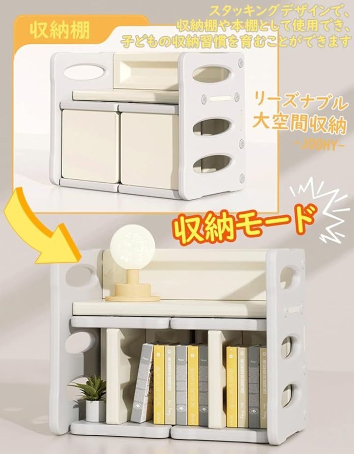 両面使用可能、お子様が小さいときは、スツールを背もたれモードとして使用でき、テーブルは物が落ちないように柵としても使えます。