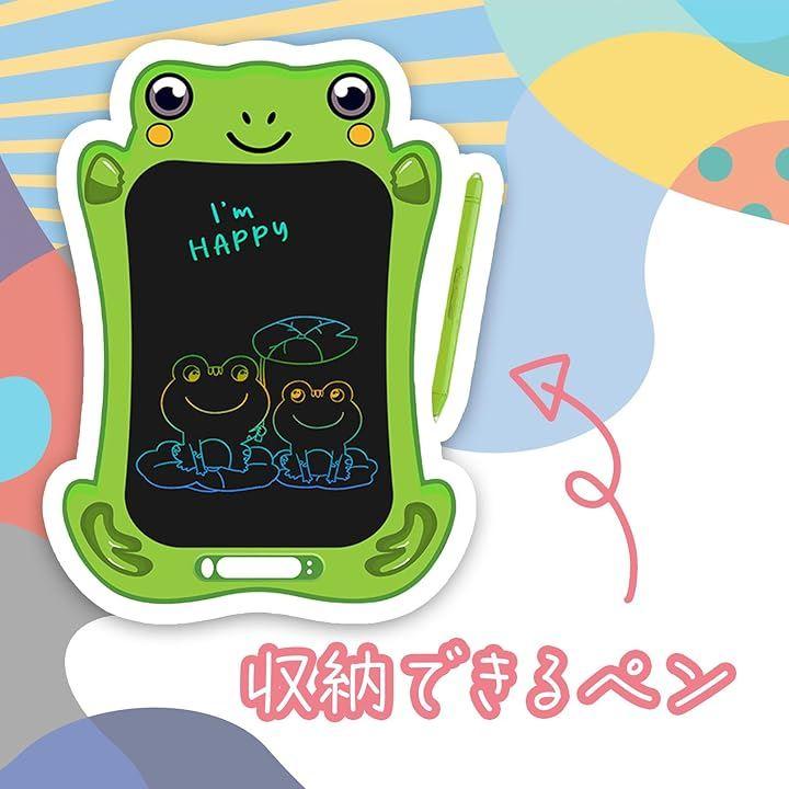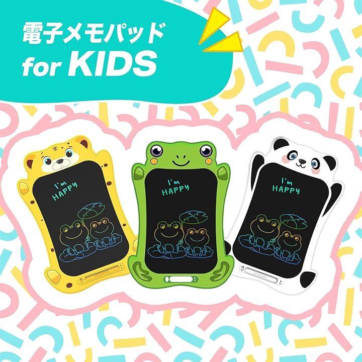 「自由に落書きして知育にも」商品内容:子供向け電子メモパッド/カラー:イエロー(トラ)、グリーン(カエル)、ホワイトxブラック(パンダ)/サイズ:171.4mmx238mmx5mm/重量:109g/素材:ABS・液晶ディスプレイ/電源:CR2025ボタン電池1個(別売)使用。