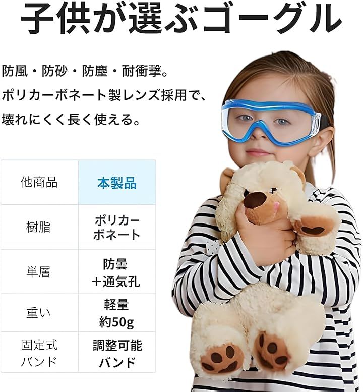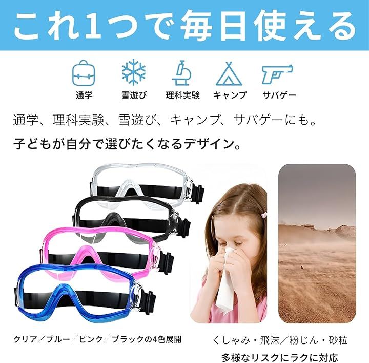 防風・防砂・防塵機能も備えており、通学時や雪遊び、キャンプ、アウトドア、自転車などさまざまなシーンで視界確保をサポートします。