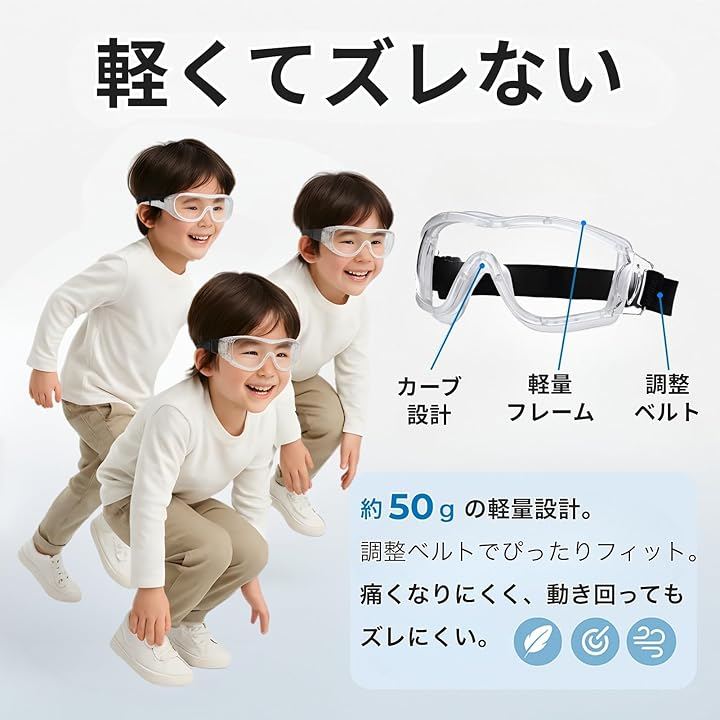 「曇らない視界で、遊びも学びももっと自由に」 子供用の保護ゴーグルとして開発された本製品は、曇り止め・防曇構造により、温度差や湿気のある環境でも視界を維持しやすい。