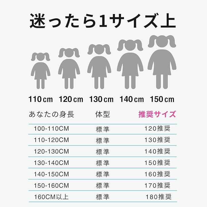 「110~160サイズ展開で幅広い体型に対応」 ジュニアサイズとして110・120・130・140・150・160の6サイズ展開。