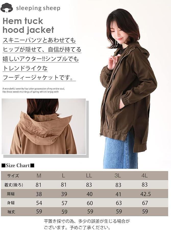 LLサイズ:着丈(後):83cm、肩幅:40cm、身幅:60cm、袖丈:59cm、袖幅:24cm、裾幅(前/後):54/57cm