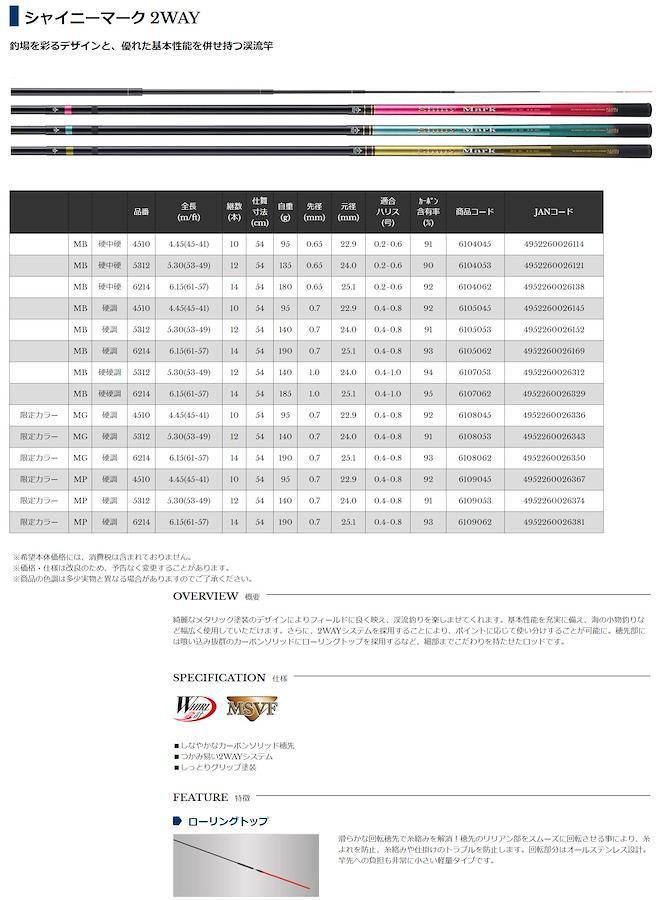 ●全長(m/ft):4.45(45-41)●継数(本):10●仕舞寸法(cm):54●自重(g):95●先径(mm):0.7●元径(mm):22.9●適合ハリス(号):0.4~0.8●綺麗なメタリック塗装のデザインによりフィールドに良く映え、渓流釣りを楽しませてくれます。●基本性能を充実に備え、海の小物釣りなど幅広く使用していただけます。●さらに、2WAYシステムを採用することにより、ポイントに応じて使い分けすることが可能に。●穂先部には喰い込み抜群のカーボンカーボンソリッドを採用するなど、細部までこだわりを持たせたロッドです。