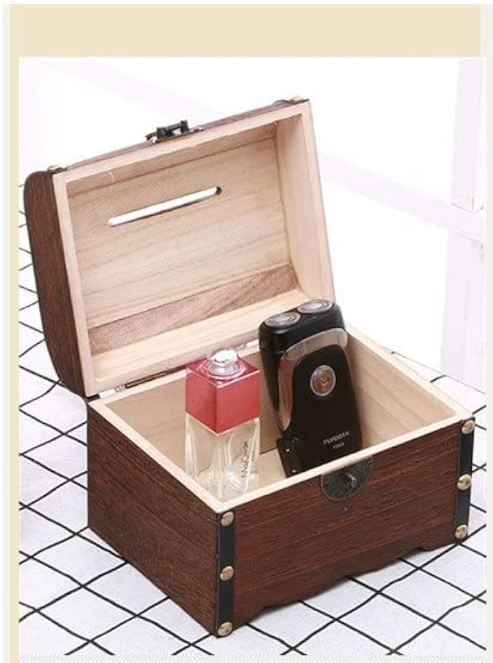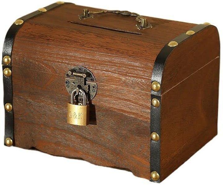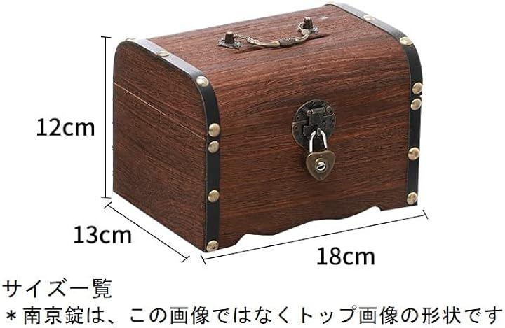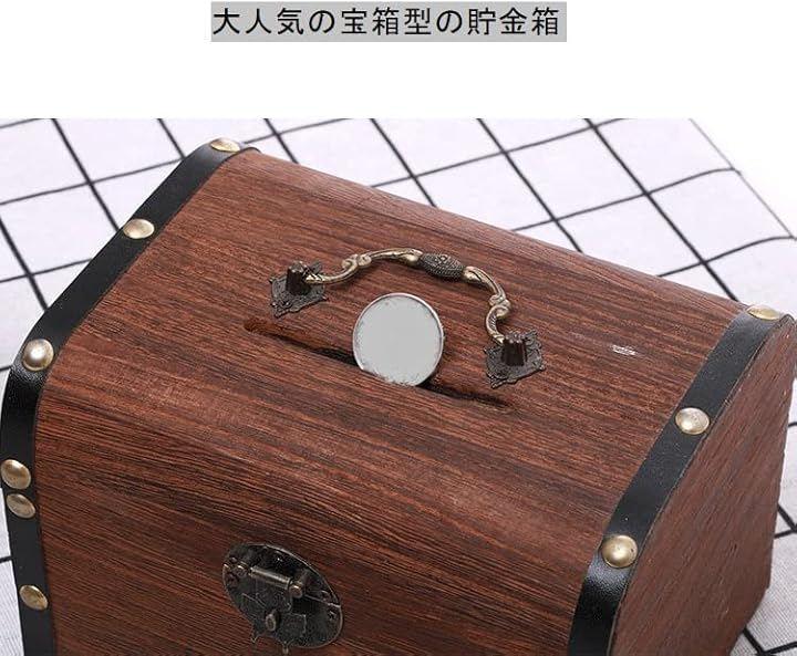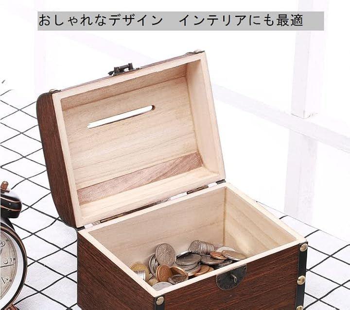「おしゃれなアンティーク風」レトロな小物やアンティーク風なデザインが好きな方におススメな木製の宝箱型貯金箱です。