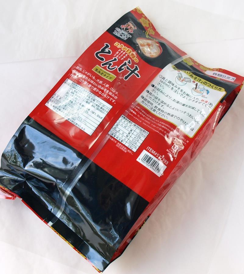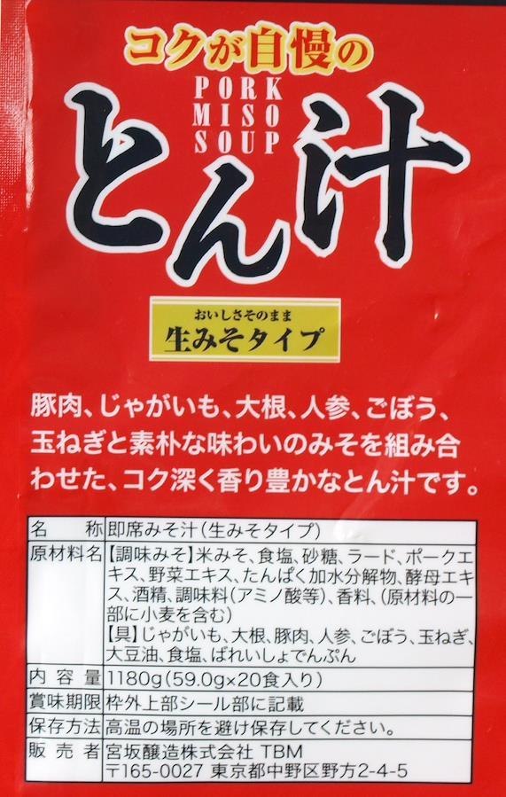 米みそ、食塩、砂糖、ラード、ポークエキス、野菜エキス。たん白加水分解物、酵母エキス、酒精、調味料(アミノ酸等)、香料、(原材料の一部に小麦を含む) 【具】じゃがいも、大根、豚肉、人参、ごぼう、玉ねぎ、大豆油、食塩、ばれいしょでんぷん