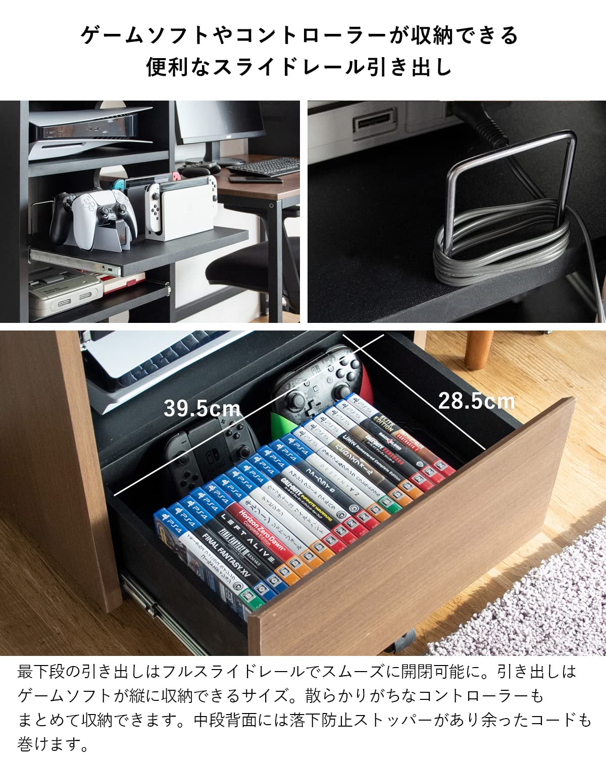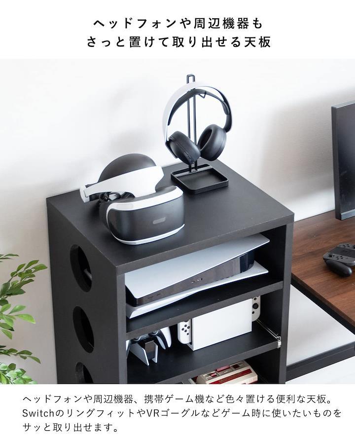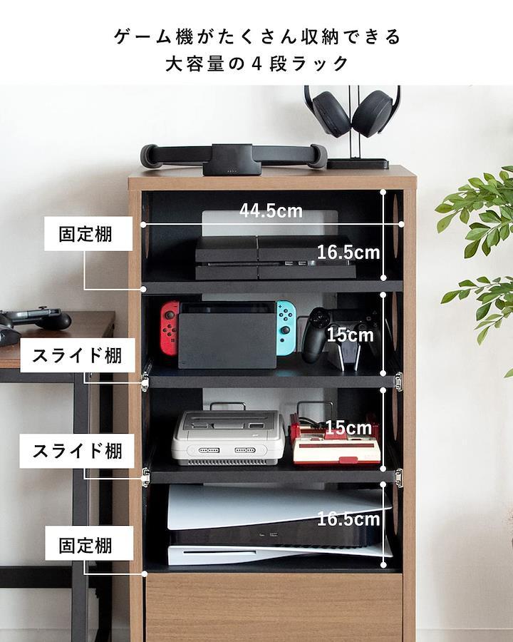 ゲーム機が最大4箇所に収納でき、内2か所はスライド棚なので使用勝手も良好。