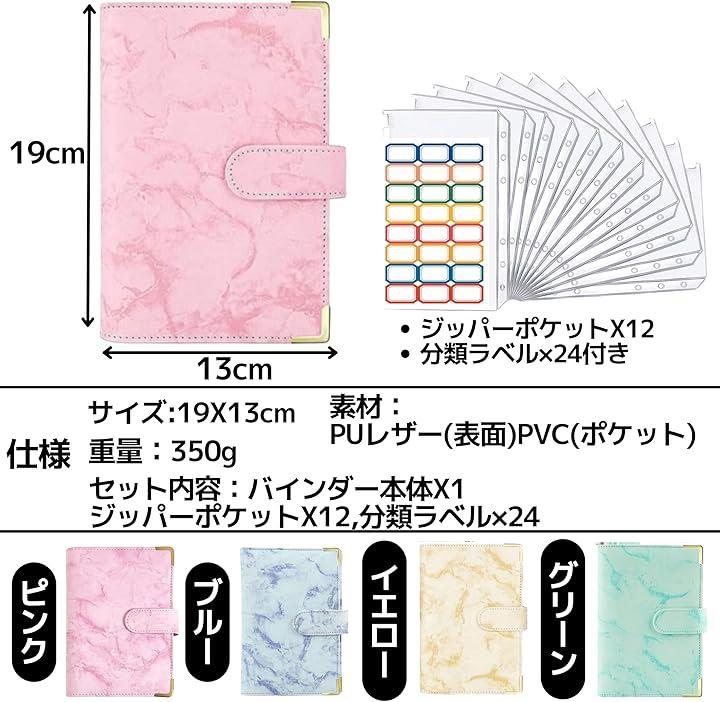 「商品スペック」サイズ:19X13cm、重量:350g、素材:PUレザー(表面)、PVC(ポケット)、セット内容:バインダー本体X1、ジッパーポケットX12枚、分類ラベルx24枚