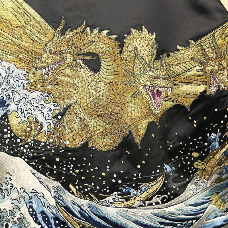 葛飾北斎の代表作【神奈川沖浪裏】をモチーフに羽ばたくキングギドラを背中にした、直球デザインの逸品。