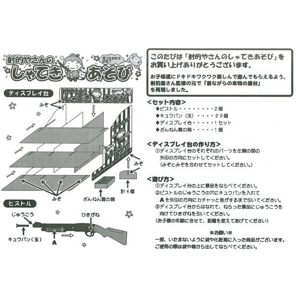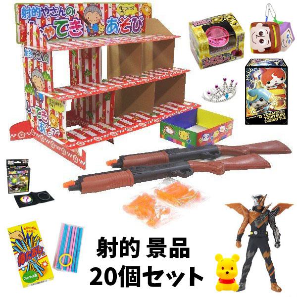 【セット内容】・しゃてきあそび什器セット×1(ピストル:2個、吸盤(玉):20個、ディスプレイ台:1セット、残念賞の箱:1個)・景品×20(内容はランダム)