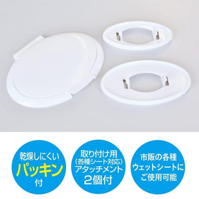 【シートが乾燥しにくいお尻拭きのふた】片手でポンと開閉できる、ウェットシートやおしりふきに取り付ける蓋です。取り付け方法は、はめるだけなのでとても簡単。ウェットシートが乾きにくくなります。各種シートに対応するアタッチメントが1個あたり大小2個付いているのも嬉しいポイントです。