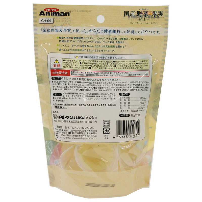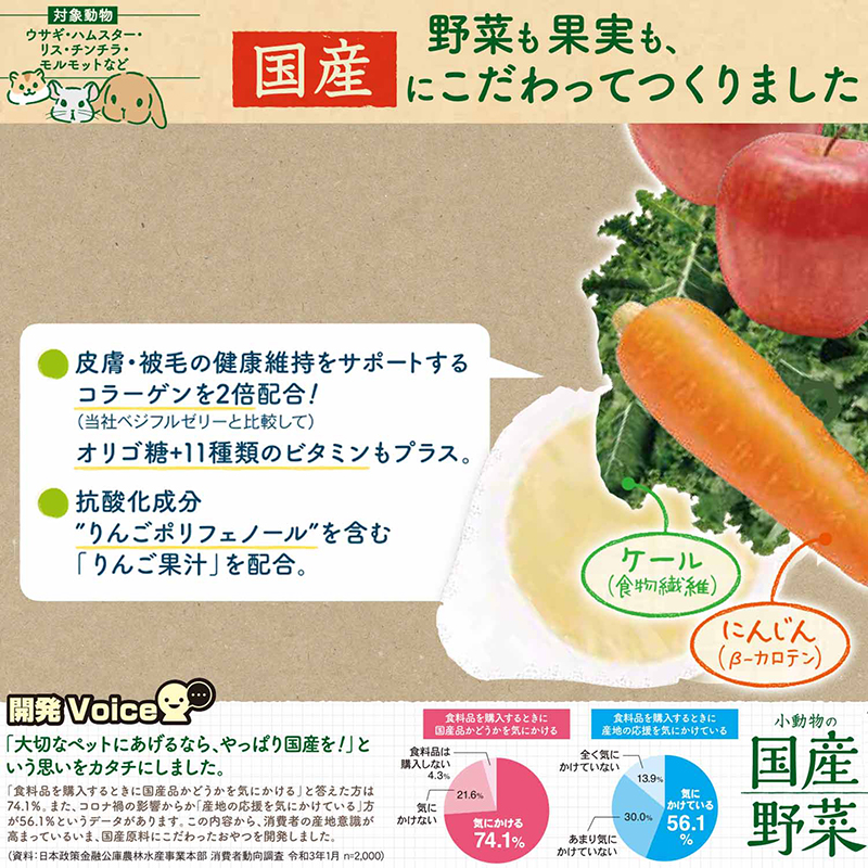 国産野菜(にんじん、ケール)と国産果実(りんご)を使用したぷるっと食感のゼリーです。・皮膚や被毛の健康維持にうれしい、コラーゲン・オリゴ糖・11種類のビタミンに加え、抗酸化成分りんごポリフェノールを含む「りんご果汁」を配合!・にんじん、ケールに含まれるβ-カロテンや食物繊維も摂れる!・食べることで水分補給もできる、ぷるぷるゼリー【対象動物】ウサギ・ハムスター・リス・チンチラ・モルモットなど