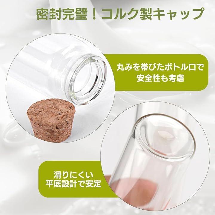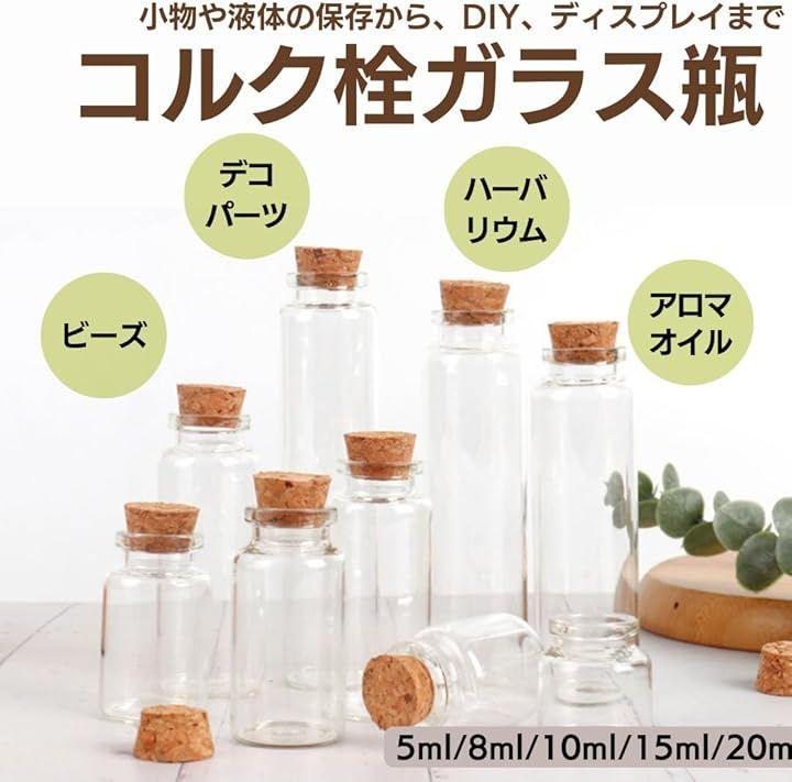 「商品詳細」セット数:20個 容量:5ml/8ml/10ml/15ml/20ml サイズ:高さ30mm/40mm/50mm/70mm/80mm、直径22mm(共通) 材質:ガラス、コルク