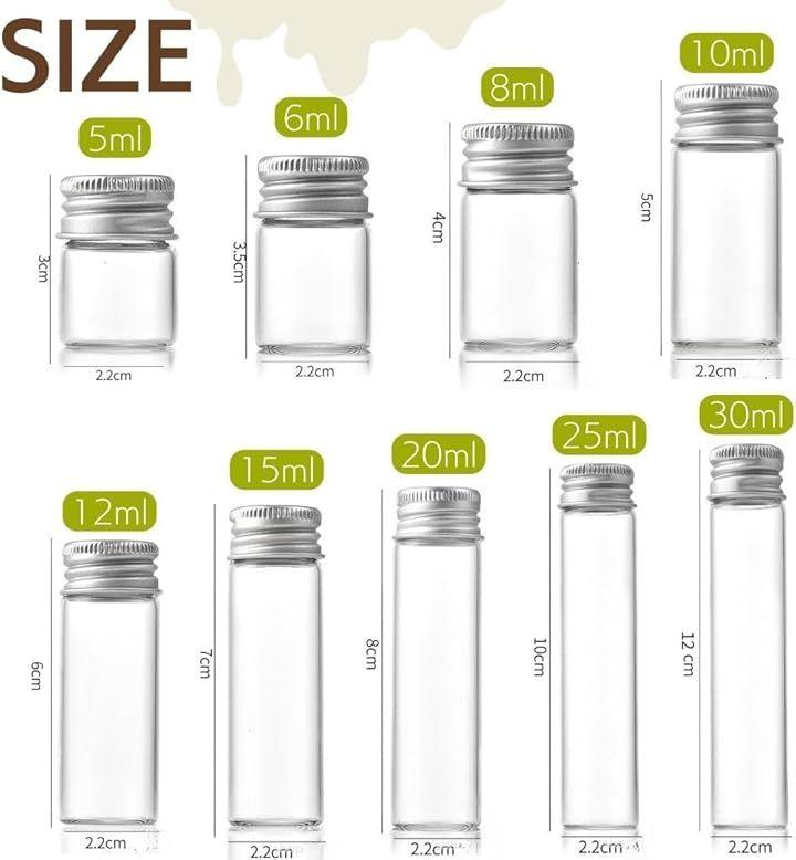 「商品内容」セット数:20個 容量:5ml / 6ml / 8ml / 10ml / 12ml / 15ml / 20ml / 25ml / 30ml サイズ:画像参照 素材:ガラス(瓶)、アルミ合金(キャップ)