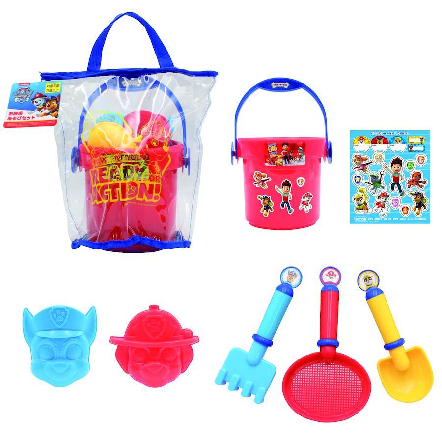 パウパトロールデザインの砂型とスコップ・クマデ・ふるいがバケツにはいっています。パウパトロールの仲間達のシール付きなので楽しく貼り付けて目印にもなります。同梱物などは3色ランダムにつき色指定はできませんのでご注意下さい 持ち運び可能なビニールパッケージ入り パウパトロールの仲間たちのシール付き 商品サイズ:26×24×16㎝