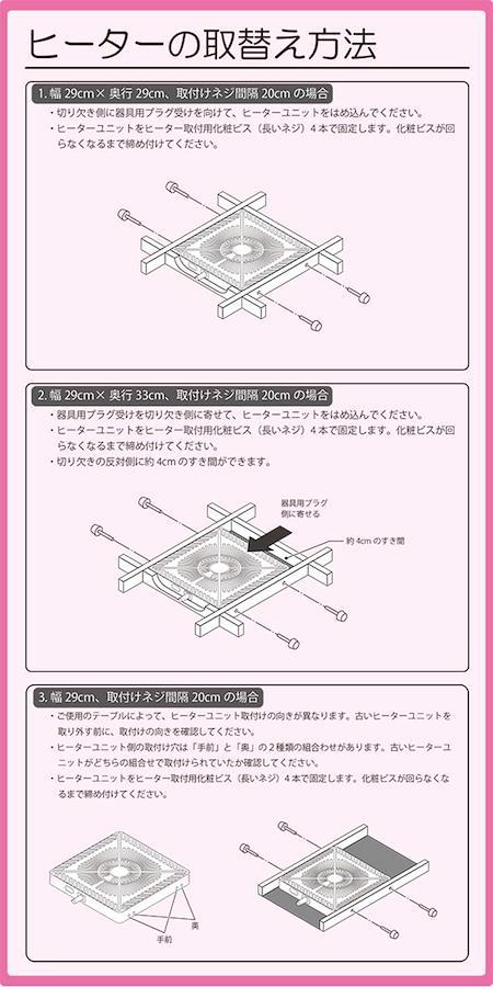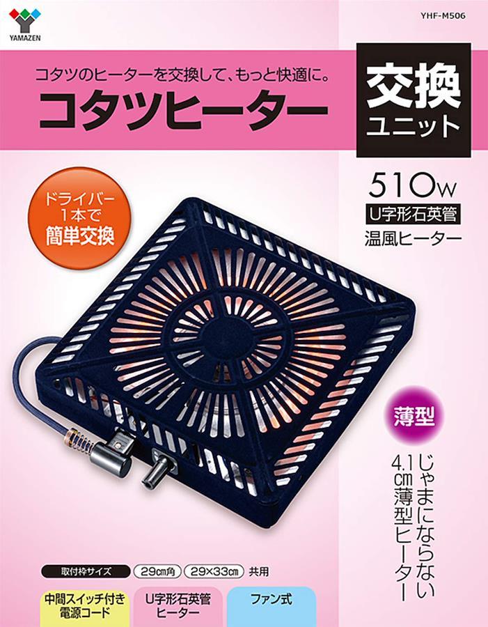 3営業日以内に発送≪新品未開封品≫:●足元すっきり薄型ファン式ヒーター。●安心設計:強度アップの電源コードプラグに電流ヒューズ入り。●取り替え用コタツヒーターユニット。●家のこたつがあったか快適こたつに大変身。●取付枠サイズ:29cm角、29×33cm共用。●共用ドライバー1本で取り換え簡単。●ヒーター取付用化粧ビス4本付き