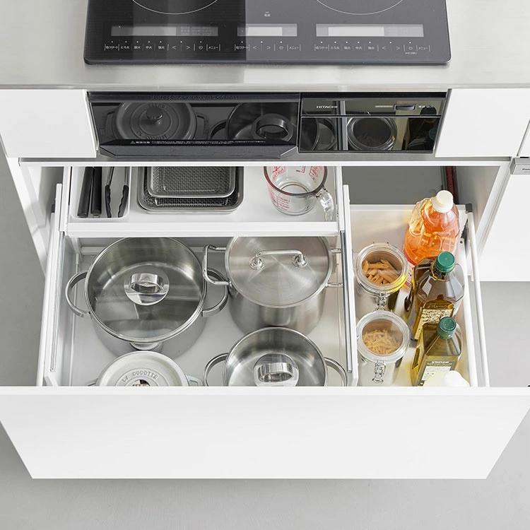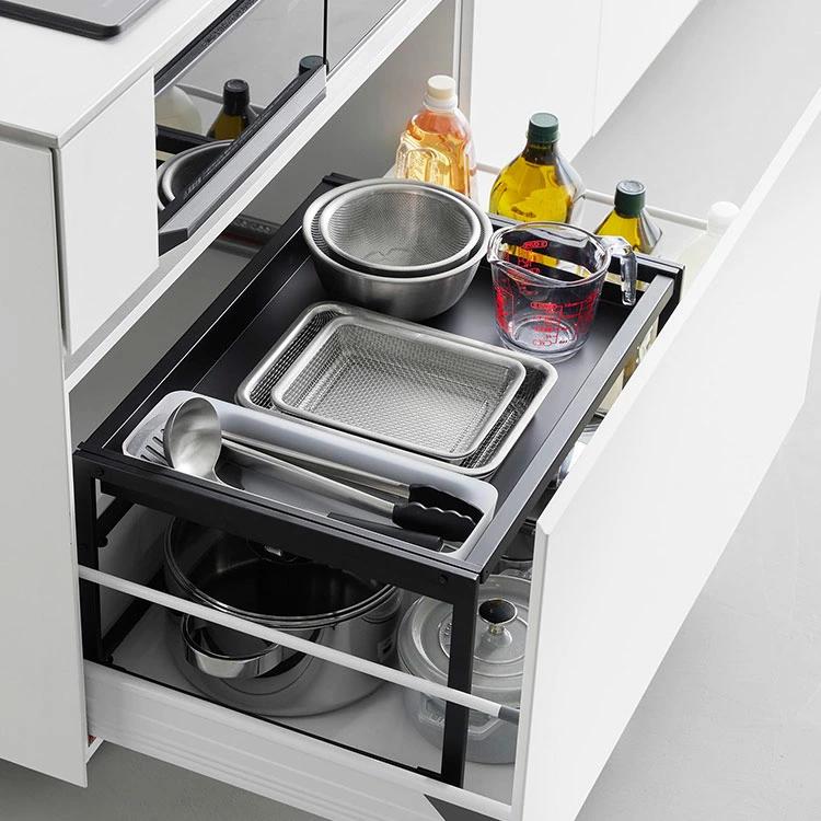 【シンク下引き出し幅伸縮スライドラック D40】シンク下の引き出しスペースを有効活用できる、奥行き約40cmの伸縮スライドラックです。これまで空いていた上部空間を活かして2段収納をつくることで、収納力をぐっとアップ。鍋やフライパン、ボウル、保存容器などを効率よく整理できます。本体は幅伸縮式。引き出しのサイズに合わせて調節できるため、スペースにぴったりフィットし、無駄なすき間をつくらず設置可能です。天板は片手で簡単にスライドできる構造。奥へスライドさせれば、下段に収納した物もスムーズに取り出せます。調理中でもサッと動かせるので、毎日の家事動線がより快適に。ごちゃつきがちなシンク下を、見やすく・取り出しやすく整える便利な収納アイテム。シンプルで洗練されたデザインは、キッチンに自然となじむtowerシリーズならではの仕上がりです。デッドスペースを活かして、使いやすいキッチンへ。毎日の収納を見直せる、機能的なスライドラックです。