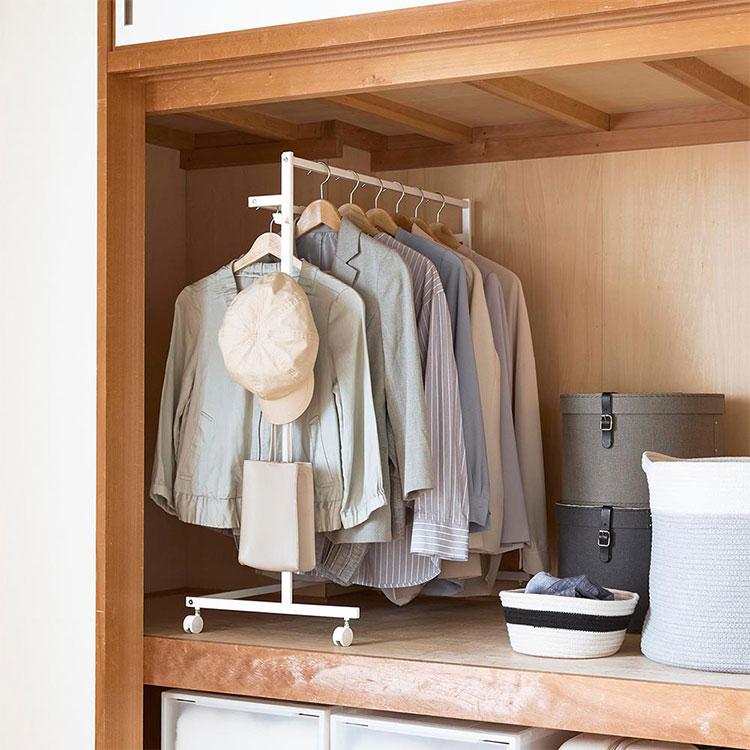 【収納力アップハンガーラック2段】2段のバーで段違いに位置をずらして収納するので肩部分の厚みを減らして収納力UP!押入れ内、縦・横どちらの向きでも収納できるので空きスペースを有効活用できます。サイドの4連フックは左右どちらにも取り付け可能。帽子やミニバッグの収納に便利です。上段、下段に服を掛ければ、服の見分けがつきやすく支度もスムーズ。