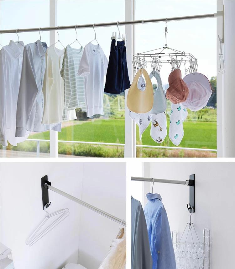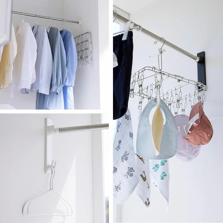 【石こうボード壁対応物干し竿ホルダー 2個組】強い力や工具は不要。室内の壁面に石こうボードピンで簡単に取り付けできる物干し竿ホルダー。日当たりの良い窓辺や洗面所やランドリールームの壁面など、好きな場所に手軽に物干しスペースを設けることができます。外干しが難しい一人暮らしや花粉や梅雨、黄砂などが気になる季節にもぴったり。フックがついているのでピンチハンガーやハンガーなども収納できて便利。直径3.5cm以内の一般的な室内用物干し竿に対応しています。※物干し竿は付属しておりません。