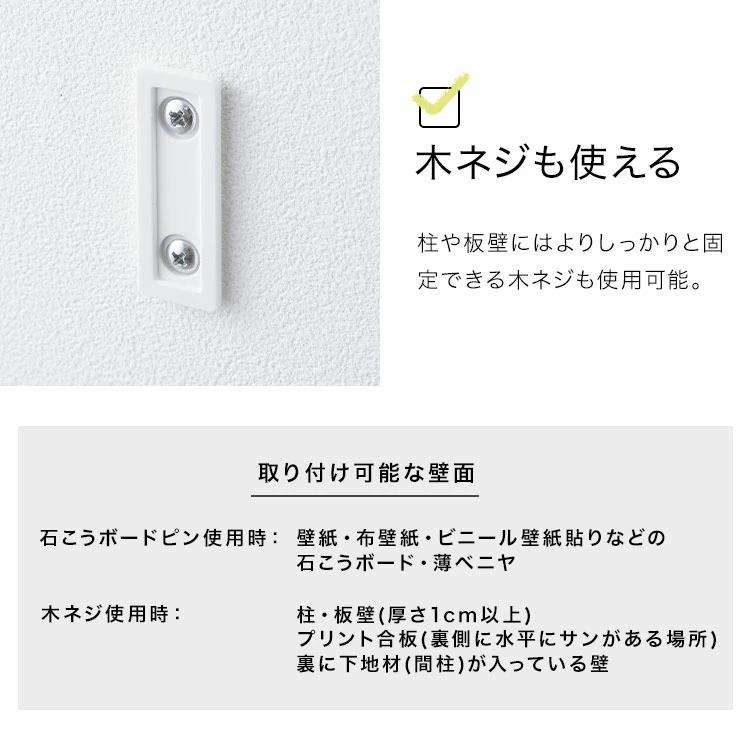 ■取り付け可能な壁面石こうボードピン使用時:壁紙・布壁紙・ビニール壁紙貼りなどの石こうボード・薄ベニヤ木ネジ使用時:柱・板壁(厚さ1cm以上)・プリント合板(裏側に水平にサンがある場所)・裏に下地材(間柱)が入っている壁