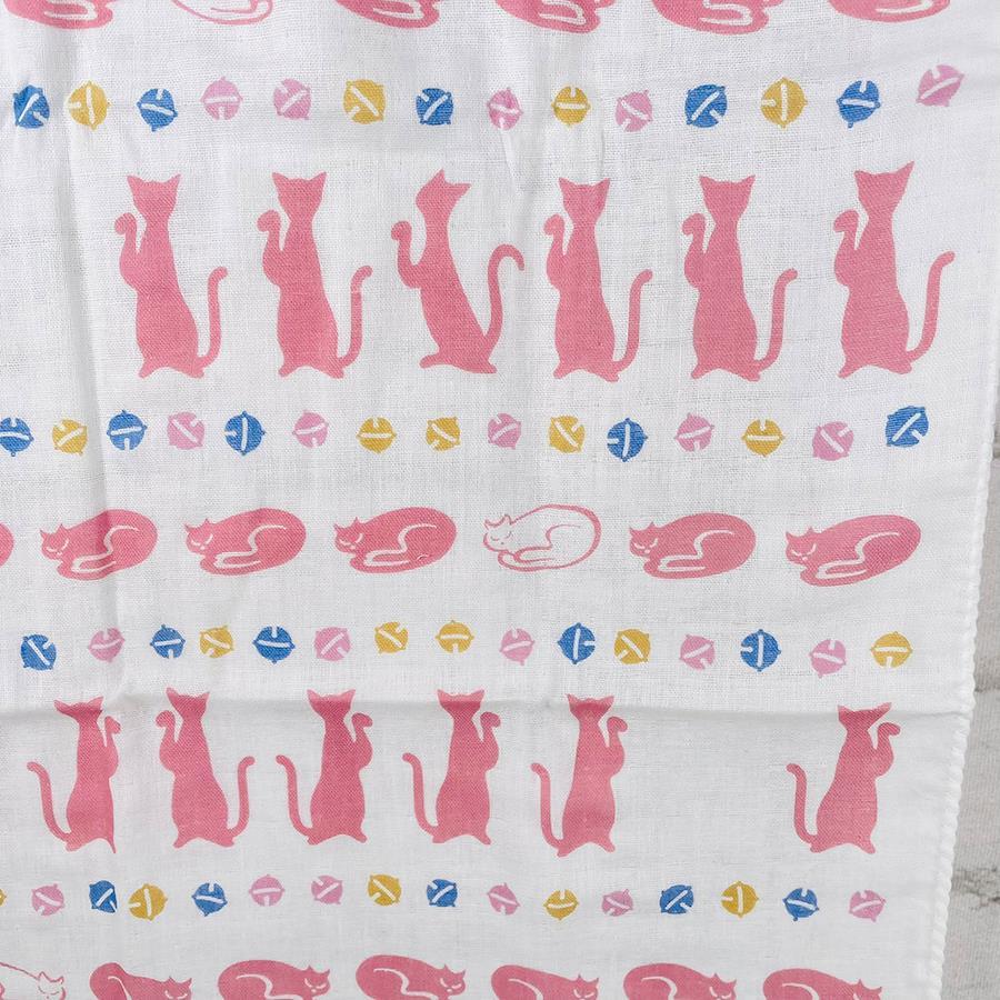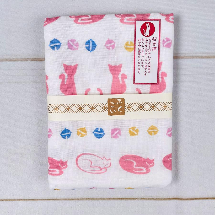 かわいい猫のイラストが描かれた日本製の手ぬぐいです。吸水性の良い二重ガーゼ素材で、ふんわりして手触りがとても良い。ふくこいシリーズは、「福来い!」にちなんで、縁起の良いイラストのデザインばかり。猫の手は、右手を上げているとお金を、左手を上げていると福や人を招くと言われています。鈴の音は魔除けとなります。ふくこいの手ぬぐいは縁が縫われているので、ほつれが気になる人にもオススメ。