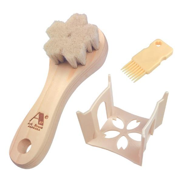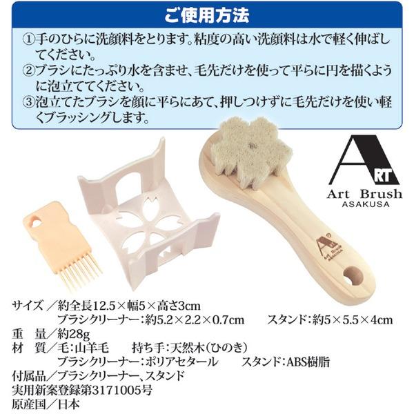 本商品はお取り寄せ商品のため、稀にご注文入れ違い等により欠品・遅延となる場合がございます。誠に恐れ入りますが、何卒ご了承ください。また、以下の場合には追加送料がかかる場合がございます。・沖縄、離島および一部地域への配送時 ・同梱区分が異なる商品の複数購入時 【同梱区分】:TS 1102 【メーカー名】アートブラシ 【型番】B000024 ●絹のような泡立ちを生み出す洗顔ブラシ ●浅草の職人が丹精込めて手作りしました ●天然毛の中でも毛質の細いヤギ毛だけを使用 ●さくらの花びら型と肌触り最高のヤギ毛 熟練職人が丹念に仕上げた洗顔専用のブラシです。洗顔に使用するブラシとして生み出されたブラシ毛には、天然毛の中でも毛質が細いヤギ毛だけを使用しました。その毛の柔らかさは手で触った瞬間に実感できるほど、非常にソフトに仕上がってます。また、ソフトなタッチながらも、しっかりと洗顔できるよう「さくら形」に毛を植え付けてあり、桜の花びら一枚一枚が微妙に自由に動き、洗顔時にはソープの泡立ちが良くなります。浅草アートブラシが作るブラシは、毛をハンドルに植毛する時に、接着剤を一切使用しません。接着をせずに植毛できる技術は、日本の職人ならではのもの。もちろん、毛は抜けにくくなってます。【商品名】 アートブラシ社 山羊毛の洗顔ブラシ さくら(スタンド付) 【サイズ】 約全長12.5×幅5×高さ3cm ブラシクリーナー:約5.2×2.2×0.7cm スタンド:約5×5.5×4cm 【重量】 約28g 【材質】 毛:山羊毛 持ち手:天然木(ひのき) ブラシクリーナー:ポリアセタール スタンド:ABS樹脂 【付属品】 ブラシクリーナー、スタンド 【生産国】 日本 【特記事項】 実用新案登録第3171005号 【ご使用方法】 1、手のひらに洗顔料をとります。粘度の高い洗顔料は水で軽く伸ばしてください。2、ブラシにたっぷり水を含ませ、毛先だけを使って平らに円を描くように泡立ててください。3、泡立てたブラシを顔に平らにあて、押しつけずに毛先だけを使い軽くブラッシングします。【注意事項】 ※スクラブ入りの洗顔料やクレンジング剤は使用しないでください。切れ毛や傷みの原因となります。※天然素材を使用しているため、ご使用になって皮膚の赤みやかゆみ、かぶれなどのアレルギー症状が出た場合は、直ちにご使用を中止してください。