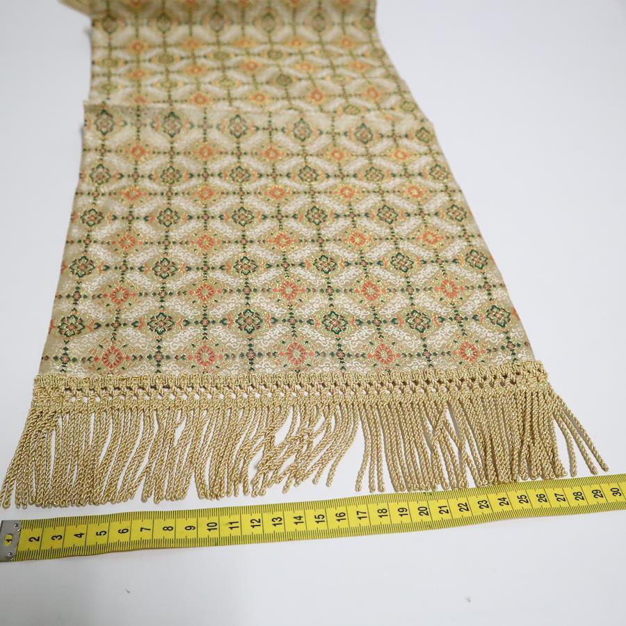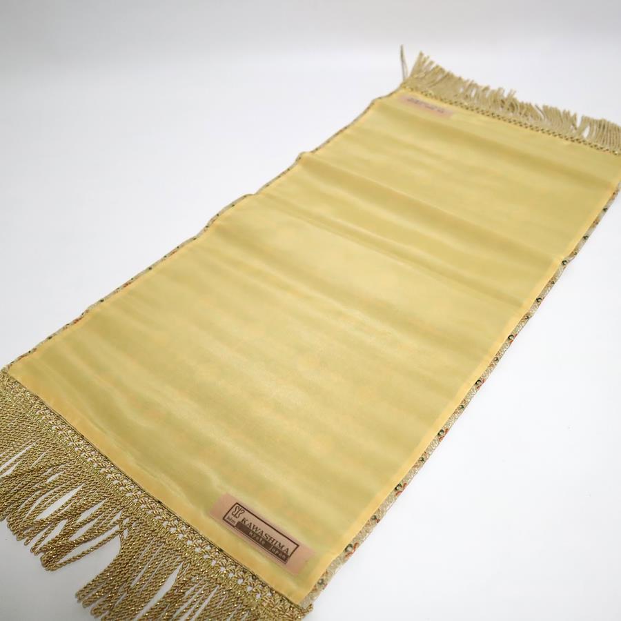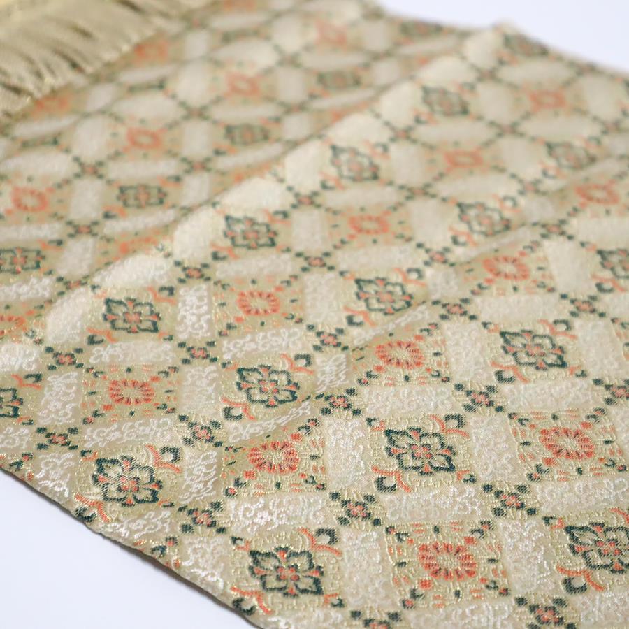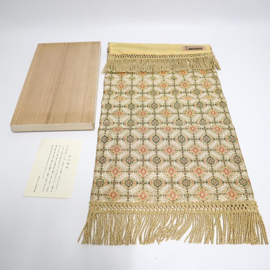 川島織物の上位ライン、絹100%に金銀糸を織り込んだ角立華紋のテーブルセンターです。金地の華やかさと光沢ある質感が、茶道具の敷物や花台、作品展示の場を上品に引き立てます。木箱入りのため贈答用にも適しています。