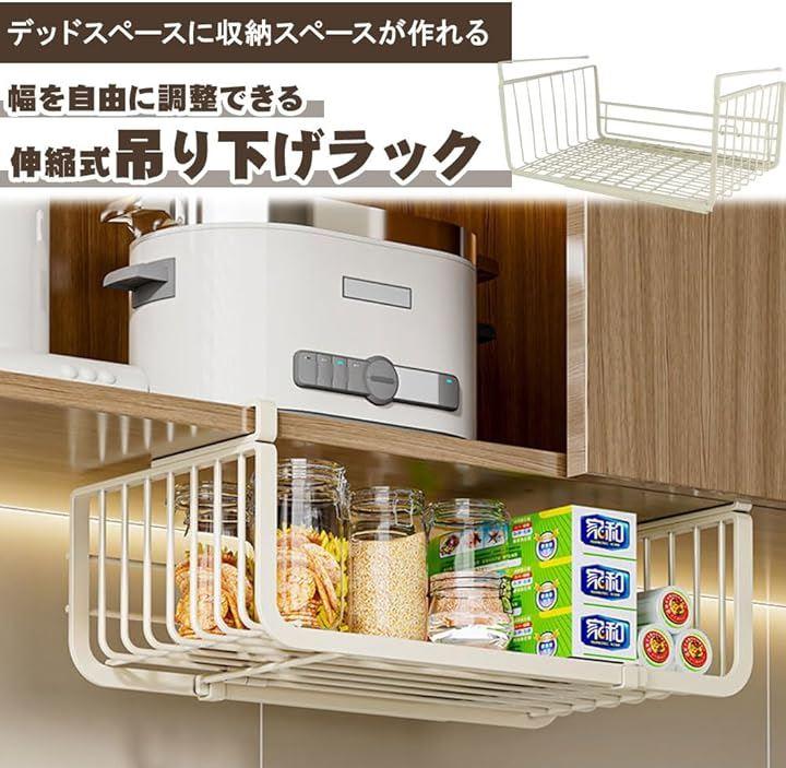 「セット内容」吊り下げ式伸縮棚x1点 「サイズ(約)」横幅:36cm~60cm 奥行:24cm 高さ:18cm 「棚板の厚さ(約)」2.5cmまで対応 「カラー」クリームホワイト 「材質」金属