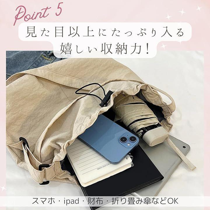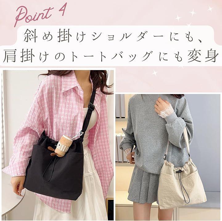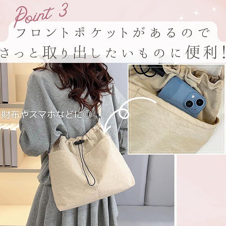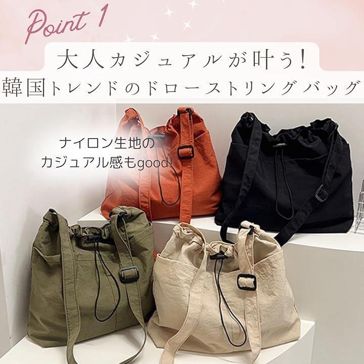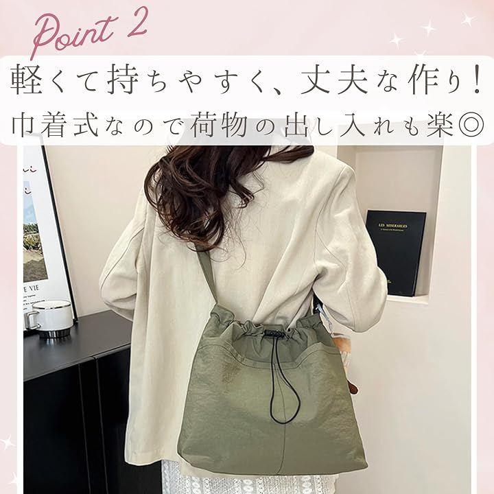「巾着xショルダーの優秀デザイン」開閉しやすい巾着タイプで、荷物の出し入れもスムーズ。