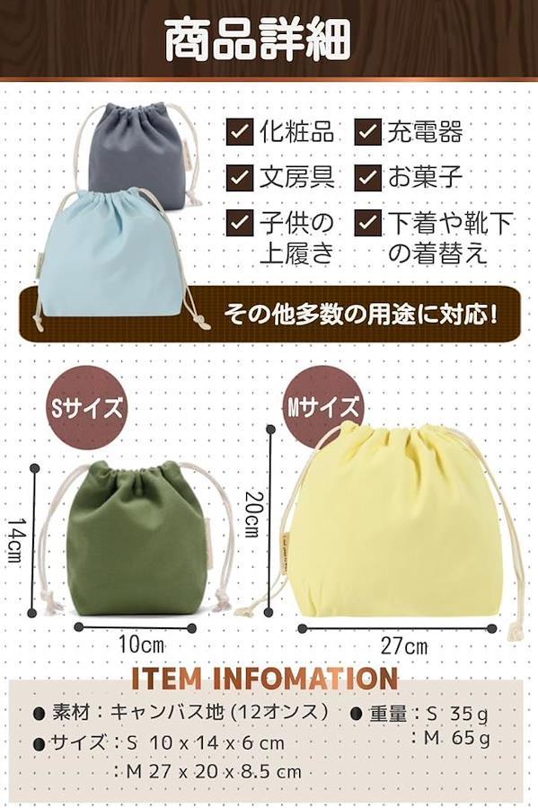 「商品詳細」 素材:キャンバス地 (12オンス) 重量:S 35g/M 65g サイズ:S 10 x 14 x 6 cm/M 27 x 20 x 8.5 cm