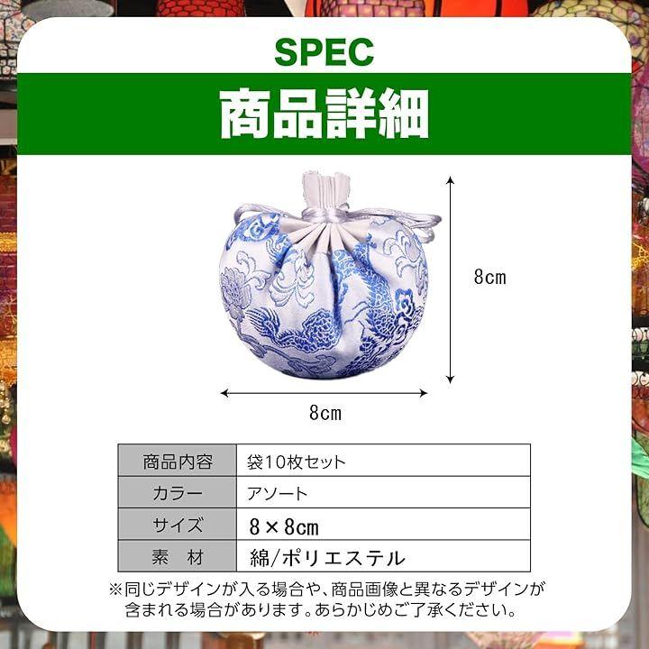 「商品内容」袋10枚セット」「カラー」アソート 「サイズ」8x8cm「素材」綿・ポリエステル *同じデザインが入る場合や、商品画像と異なるデザインが含まれる場合があります。