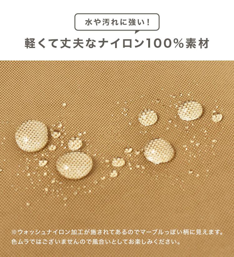汚れてもさっと拭けるよう、丈夫で水にも強いナイロン100%素材を採用。一見色ムラ?のように見えるものは、風合いを出すため染色後ウォッシュをかけた、ウォッシュナイロンという加工です。ふんわりとしたマーブルのような色がとっても可愛い!