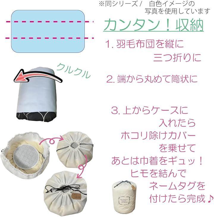 「クルっと丸めて入れるだけ。カンタン収納」羽毛布団を畳んで丸めて(羽毛布団内の空気を抜きながら)、巾着型のケースにサッと入れてヒモを結ぶだけでカンタン