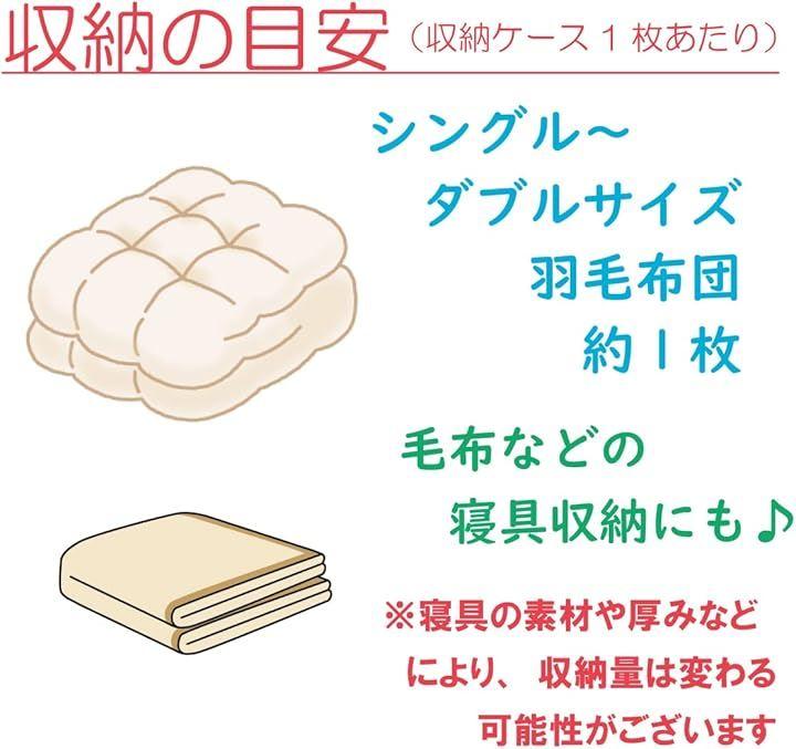 収納目安(収納ケース1枚あたり) : 羽毛布団(シングル~ダブルサイズまで)約1枚 *収納する寝具の素材や厚みなどにより収納量は変わる可能性がございます。