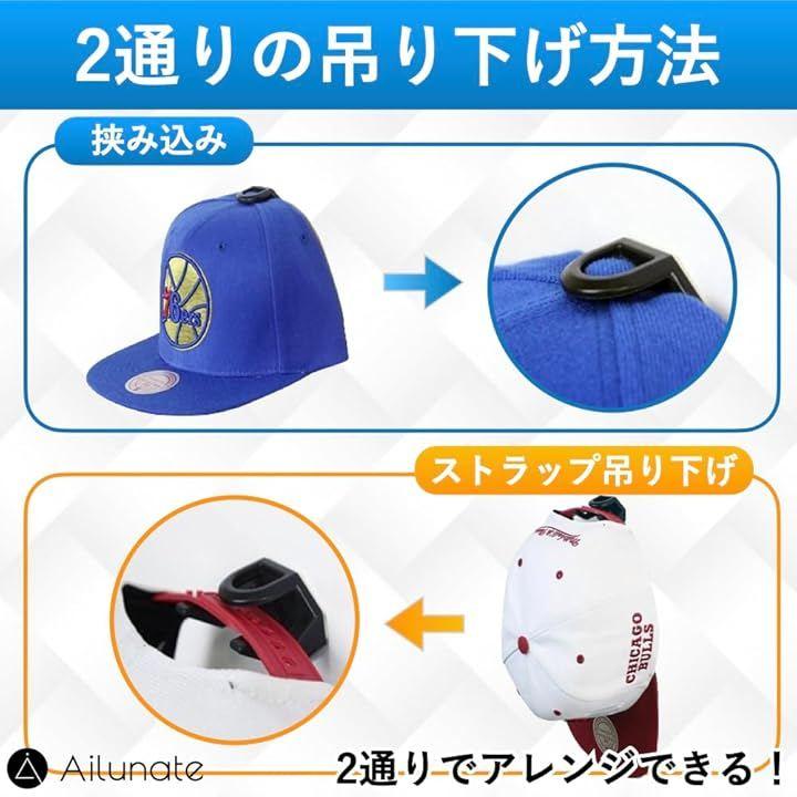 「2通りの吊り下げ方法」帽子ホルダーの間にキャップを挟むことで帽子のつばが前を向いた状態で飾ることができます。