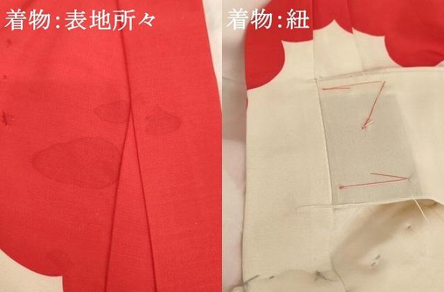 着物【正絹】の状態は接写画像のように表地に汚れ、紐に糸解けがございますが