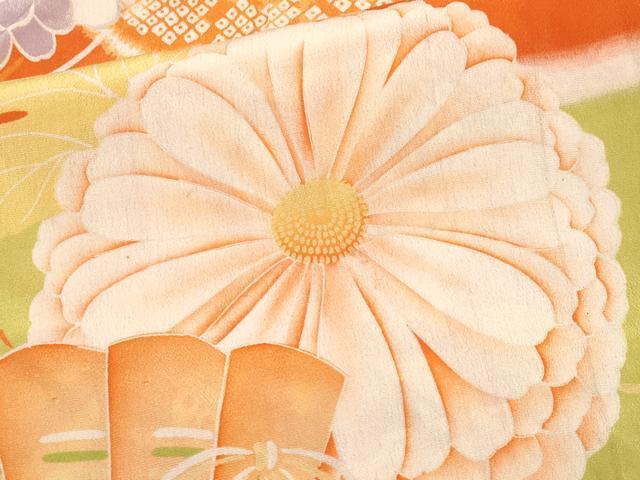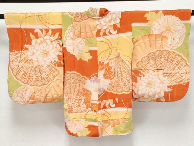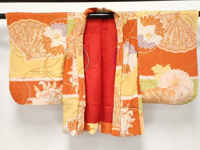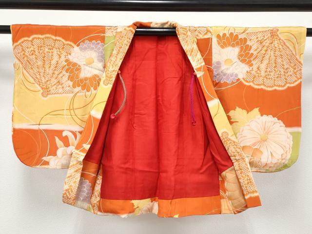 Heiwaya Main Store's finest antique Taisho Romance style girl's haori jacket for Shichi-Go-San (7-5-3) celebration, 3 years old, with a cypress fan and flower pattern, vermilion background, a masterpiece. CYAA4984s6
