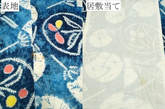 状態は接写画像のように表地所々・居敷当てに薄いシミ・汚れがございます。