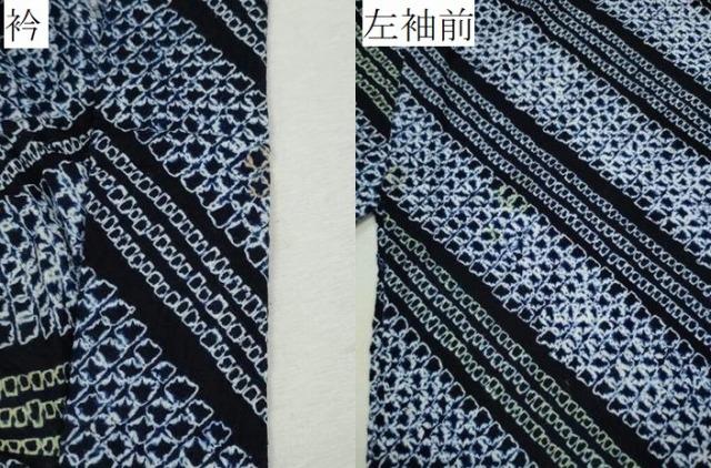 状態は接写画像のように衿に薄いシミ、左袖前に染め移りがございますが