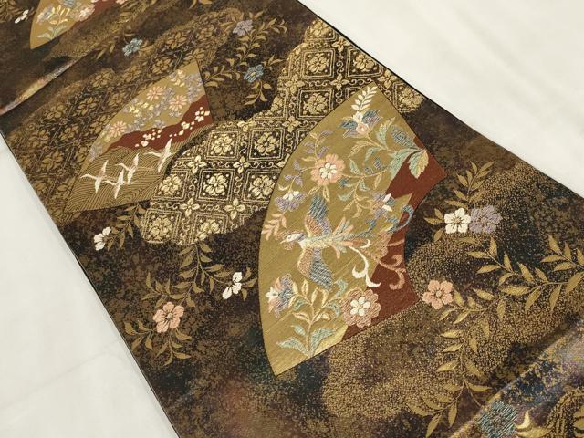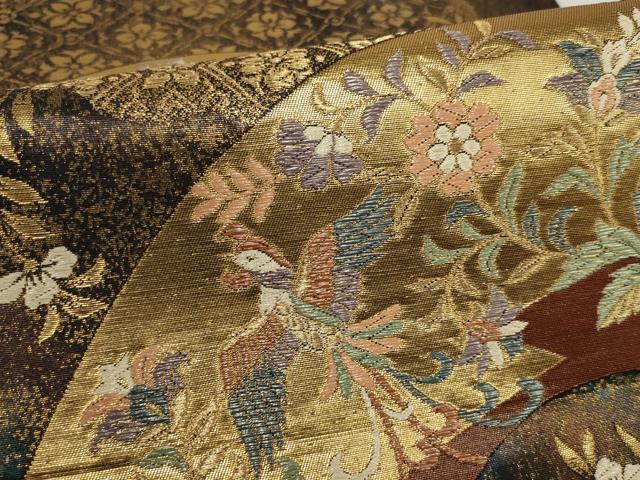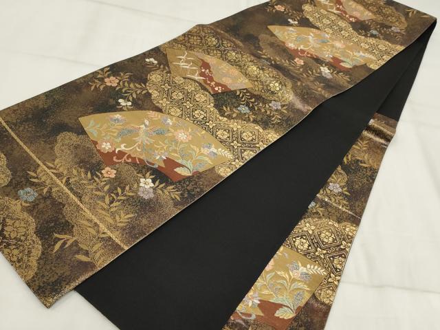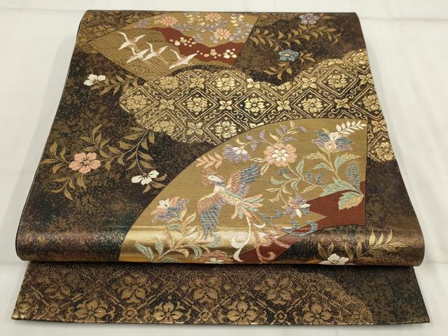 Heiwaya Kimono ▼ Six-panel patterned obi sash, paper fan flower and bird motif, black background, gold thread, pure silk, exquisite item AABI3395wj