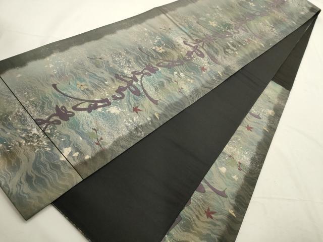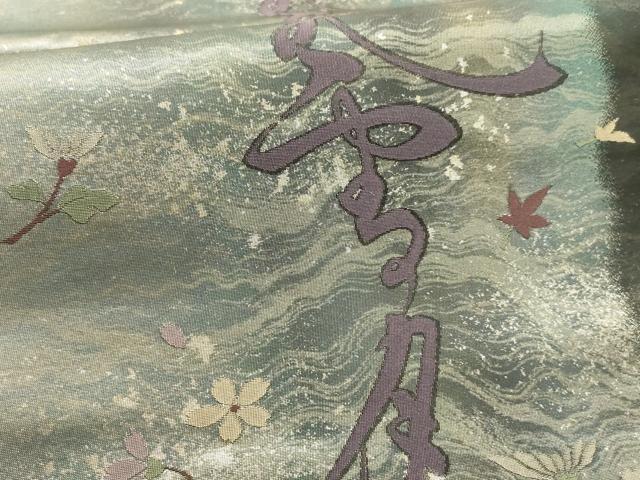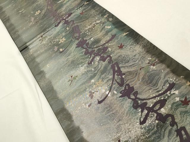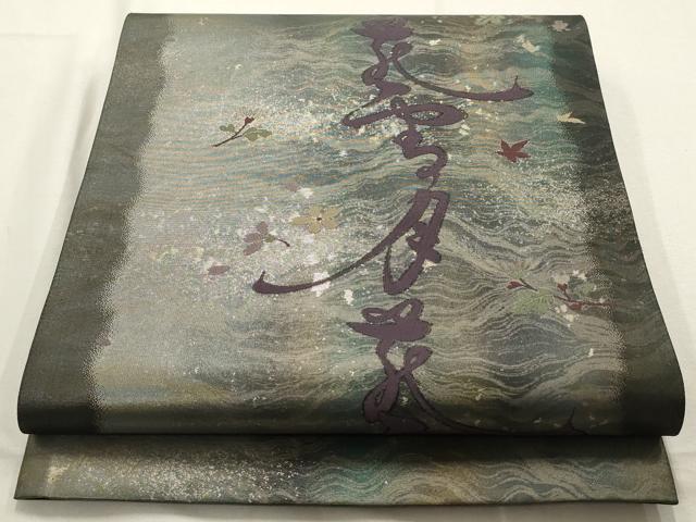 Heiwa-ya Kimono ▼ Six-way Pattern Obi, Snow, Moon, and Flowers, Black Background, Silver Thread, Drawn Leaf, Pure Silk, Excellent Item, AABD7821wj