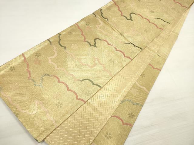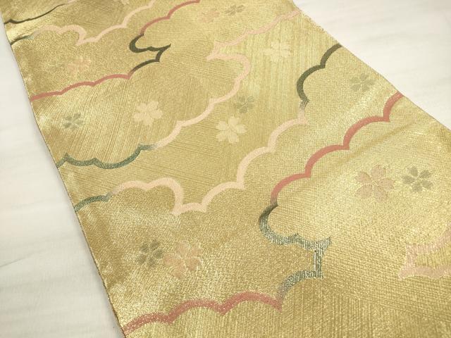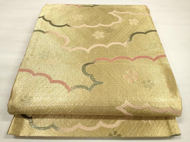 Heiwaya Kimono ◎ Saga Nishiki Six-Panel Patterned Obi Sash, Cloud and Dancing Cherry Blossom Design, Gold Thread, Pure Silk, Exquisite Item, DABE2391xg