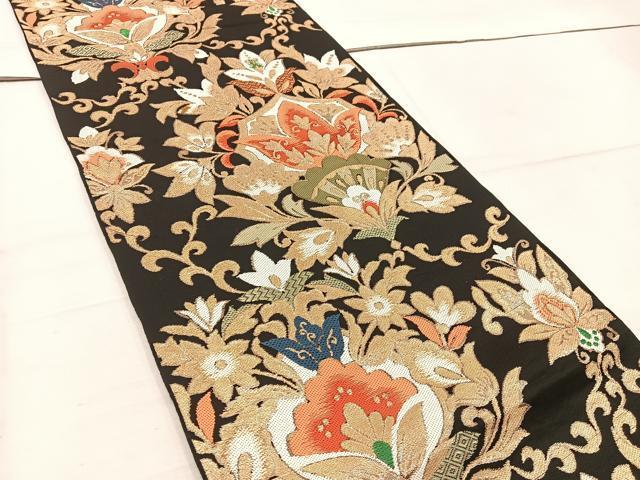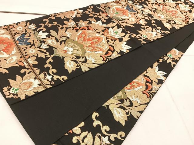 Heiwaya Kimono ◎ Six-pass pattern genuine bag obi, Karaori, chintz floral design, black background with gold thread, pure silk, exquisite item BAAW1255mz