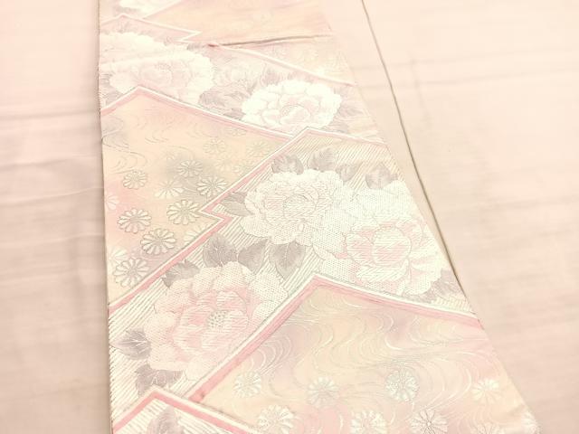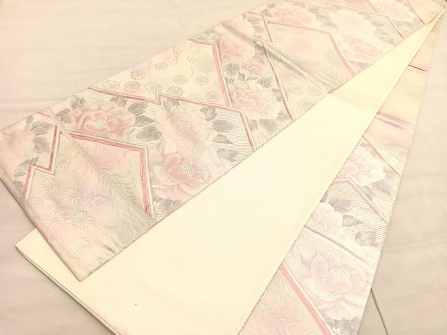Heiwa-ya Kimono ◎ Six-pass pattern obi, Karaori, pine bark diamond, peony flower design, silver thread, pure silk, exquisite item BAAV8521hv