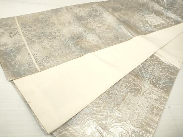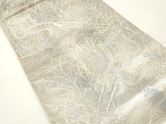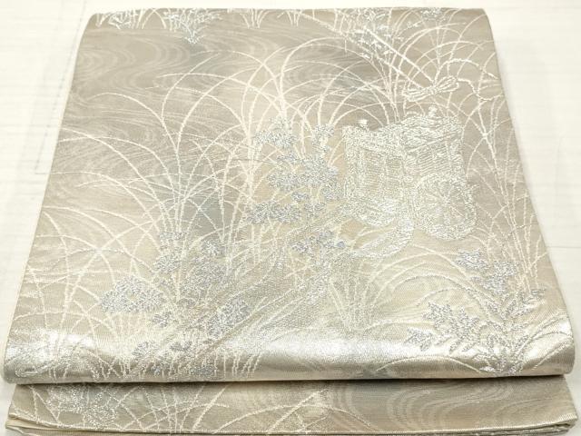 Heiwa-ya Kimono ◎ Six-way Pattern Obi with Imperial Carriage and Flower Design, Silver Thread, Pure Silk, Excellent Item, DABA3208qa
