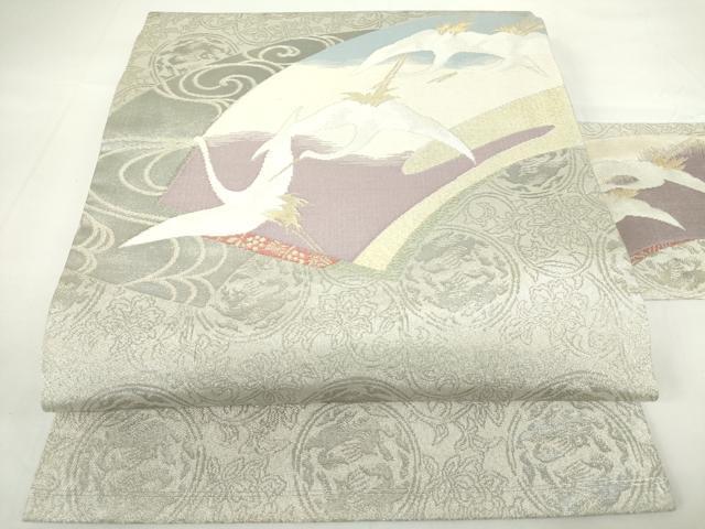 Heiwaya Kimono ◎ Tsumuri 9-inch Nagoya Obi (Sash) with Flying Crane Design on Paper, Gold and Silver Thread, Pure Silk, Excellent Item, DAAZ5581ea