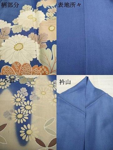 状態は接写画像のように柄部分・八掛・衿山に薄い汚れ、表地所々にヤケがございます。