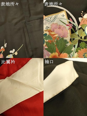 状態は接写画像のように表地所々にヤケ、表地所々に薄い汚れとアク、比翼衿・袖口に薄い汚れがございますが